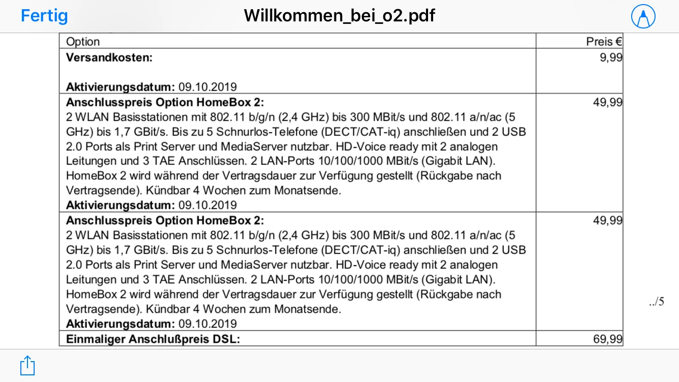vor ein paar Tagen erhielt ich meinen O2 Willkommensbrief, der die wichtigsten Daten zu meinem DSL Vertrag enthält. Unter den Angegebenen Kosten ist der Anschlusspreis für die HomeBox 2 zweimal aufgeführt. Da ich diese offensichtlich nur einmal bestellt habe möchte ich diese nicht zweimal bezahlen. Zudem ist ein Rabatt aufgeführt der mir den Anschlusspreis für die Homebox 2 um 100% ermäßigt (demnach ist dieser kostenlos).