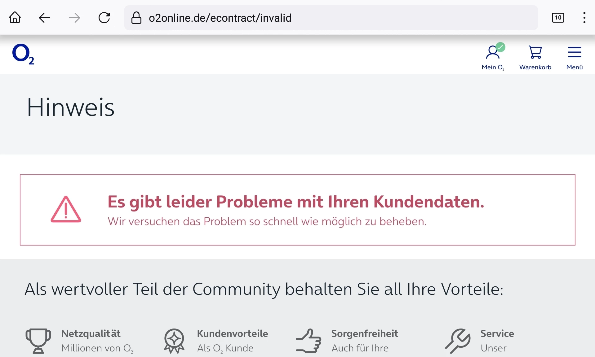 “Es gibt leider Probleme mit Ihren Kundendaten. Wir versuchen das Problem so schnell wie möglich zu beheben.”