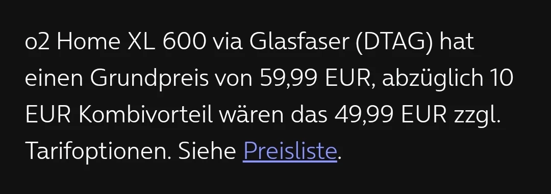 o2 Home XL 600 via Glasfaser (DTAG) hat einen Grundpreis von 59,99 EUR, abzüglich 10 EUR Kombivorteil wären das 49,99 EUR zzgl. Tarifoptionen. Siehe Preisliste