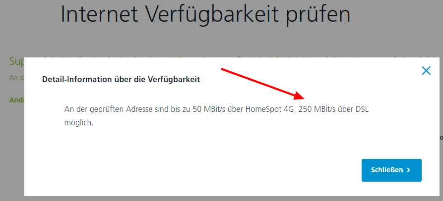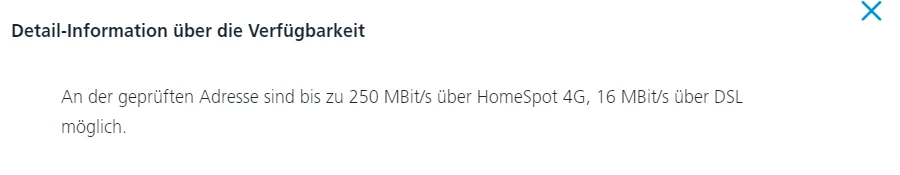 Die an deiner Anschlussadresse voraussichtlich maximal mögliche Geschwindigkeit siehst du, wenn du in der o2 Verfügbarkeitsprüfung auf das kleine “i” klickst. Was steht dort?