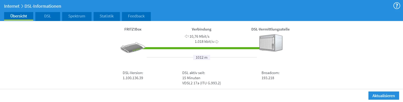 Mach mal bitte einen Screenshot der DSL-Informationen: Übersicht, DSL, Spektrum und Statistik.
