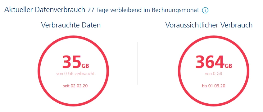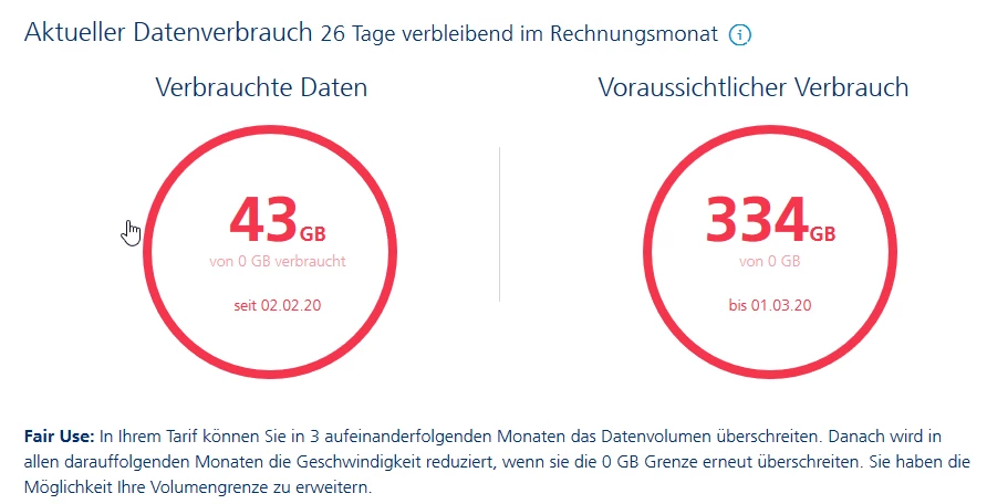 Weisst Du was? Ich habe das O2-Team gefragt und ich bin mir sicher, dass diese mit einem Blick eine Erklärung haben. Der 1.3. ist lange vorbei und es ist mein voraussichtliches Datenvolumen bis zu diesem Zeitpunkt. Wenn die die Anzeige nicht im Griff haben, sollten sie sie abschalten. Und kuck mal, ich habe schon 407 GB im März (2020!) verbraucht. Dann hätte ich ja gestern gar nicht so schnell sein können….