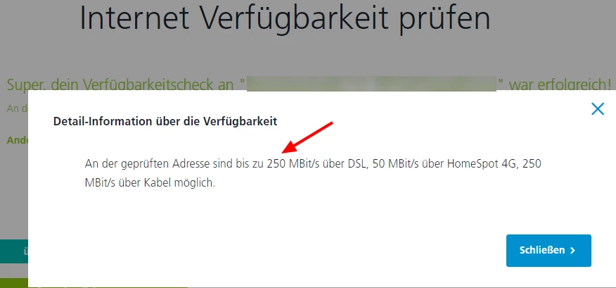 Zu erwartende Geschwindigkeiten siehe Verfügbarkeitsprüfung (auf das kleine “i” klicken) und Produktinformationsblatt. Man beachte den Unterschied im Upload bei den Kabel-Anschlüssen.