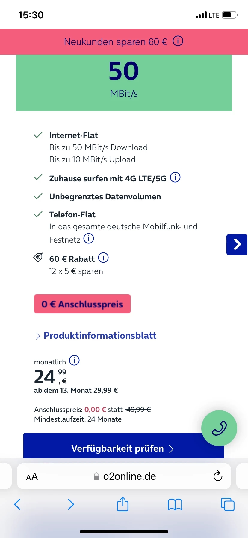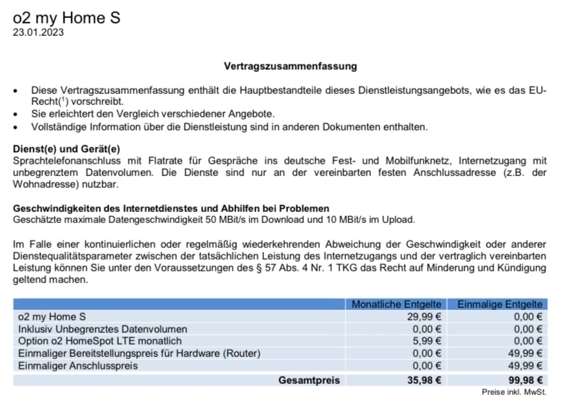 Auch als mir der Mitarbeiter den Tarif (O2 my home S) zuschaltete, stellte sich der Preis als sehr teuer heraus.  Auf der Website beträgt der Preis ohne Router 24,99 € und kostenlose Verbindung, und ein O2-Mitarbeiter hat mich für 29,99 € ohne Router und 100 € für die Verbindung verbunden!