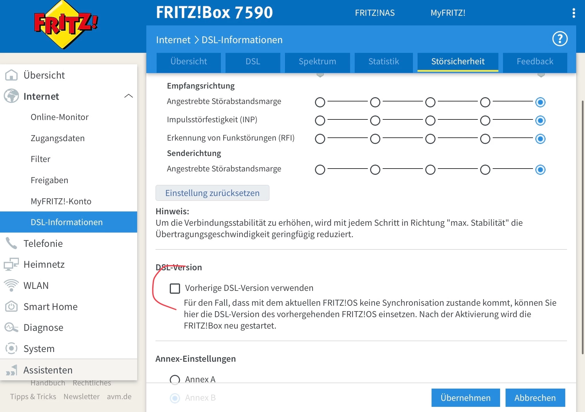@Mullekular Unten links im Hauptmenü der Fritzbox Ansicht „Erweitert“ aktivieren. Dann den Haken bei „vorherigen Dsl Treiber verwenden“ setzen.