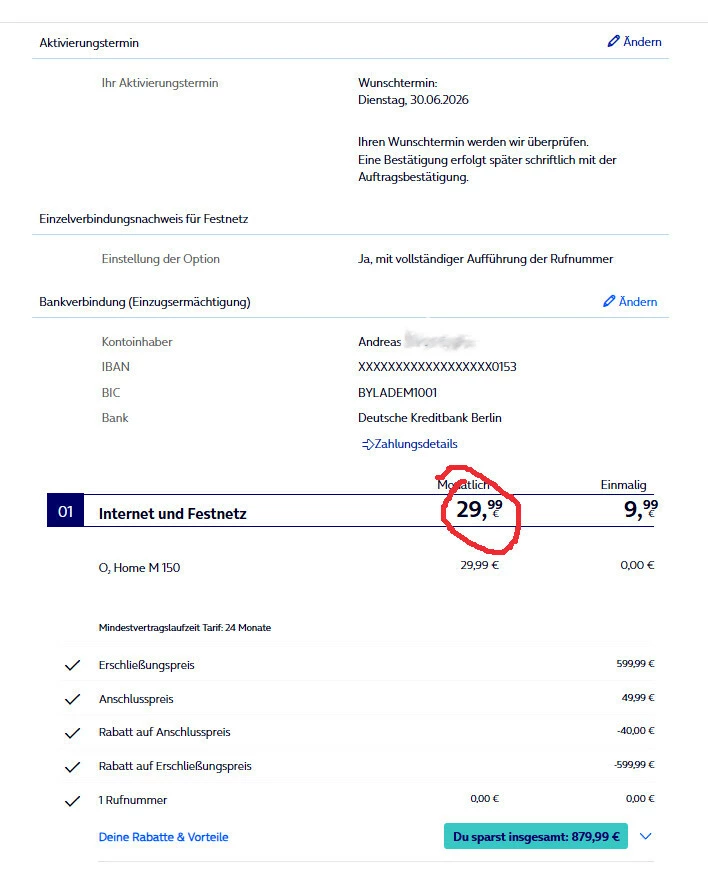 Mir wurde vom Kundenservice ein Angebot für einen Technologiewechsel von DSL auf Glasfaser unterbreitet. Dabei wurde mir bestätigt, dass der Kombivorteil greift, sodass ich für den o2 Home M 150 Tarif 29,99 € für 24 Monate zahlen würde. Anschließend erhielt ich eine E-Mail mit der Bitte um Bestätigung.