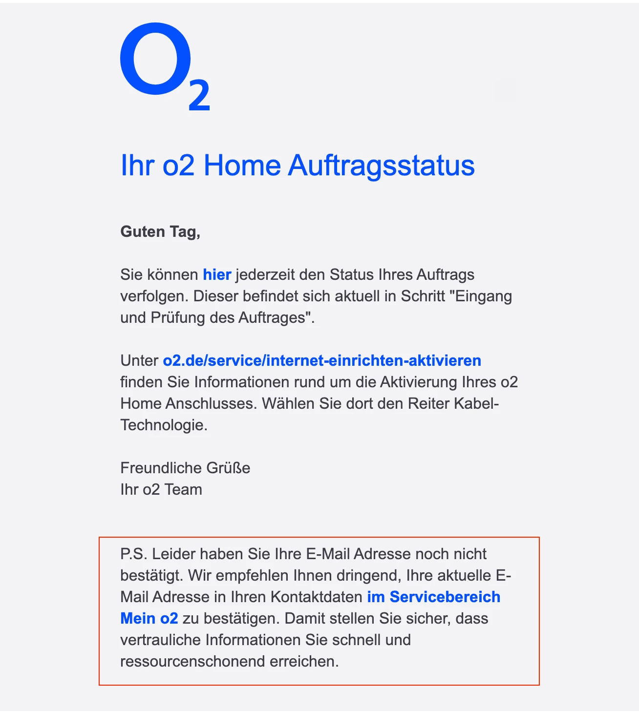 Da Registrierung für “Mein o2” erst nach der Aktivierung möglich ist, kann auch die Bestätigung der E-Mail-Adresse erst zu diesem Zeitpunkt erfolgen.