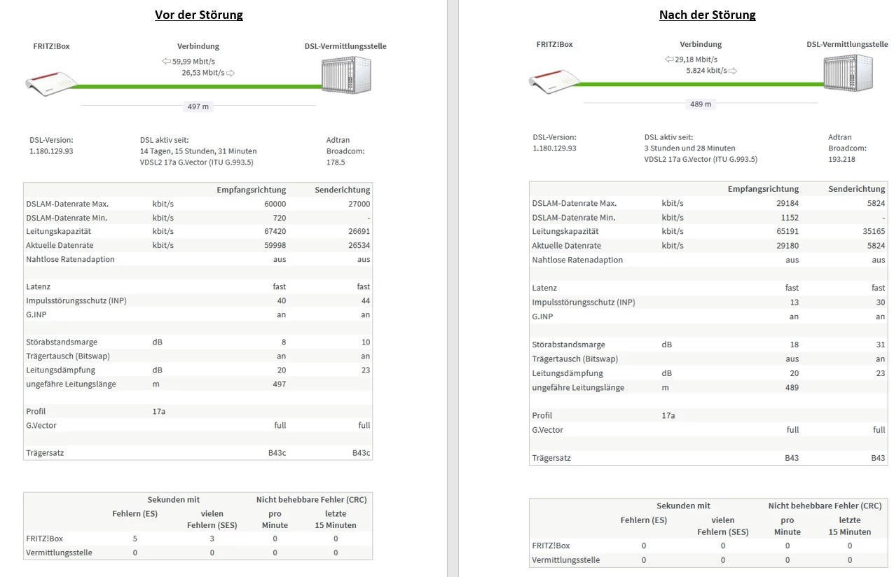 Leider ist nun so, dass ich vor der Störung eine Synchronisierung von 59,99MBit/s und 26,53MBit/s hatte. Nach der Entstörung habe ich nun nur noch eine Synchronisierung von 29,18MBit/s und 5,824Mbit/s.
