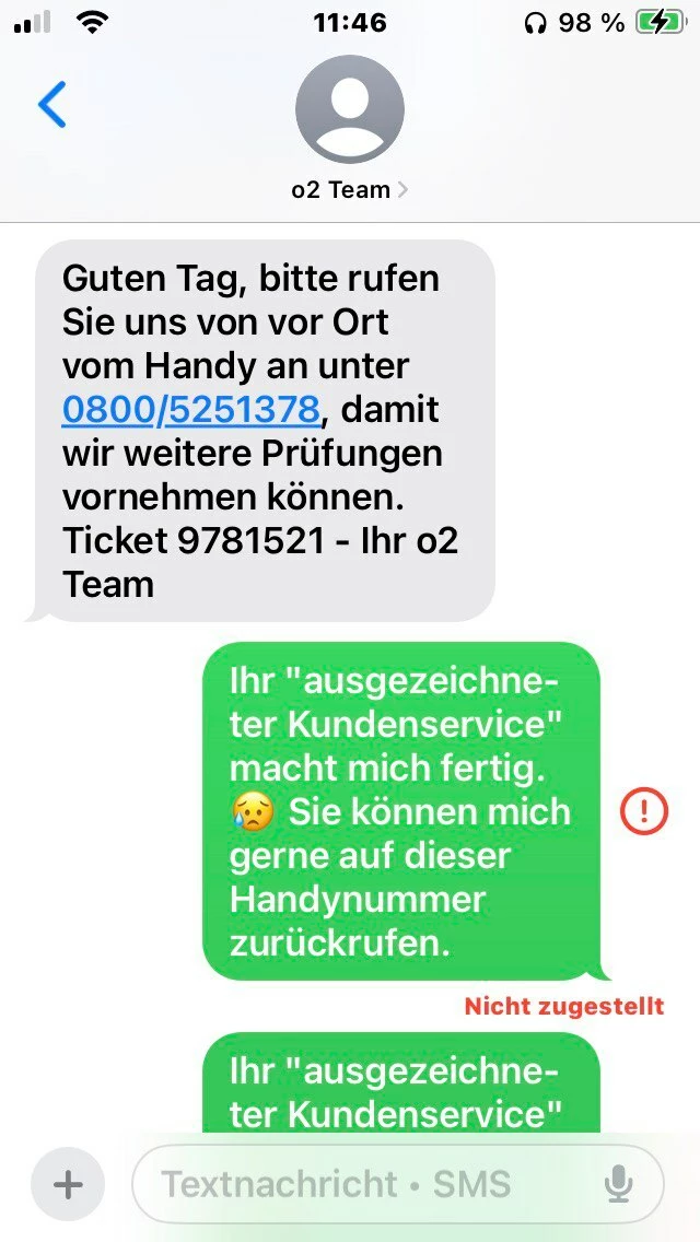 Jetzt bekomme ich laufend SMS, dass ich diese nicht erreichbare Hotline zurückrufen soll. O2, ihr habt meine Nummer. Ruft einfach