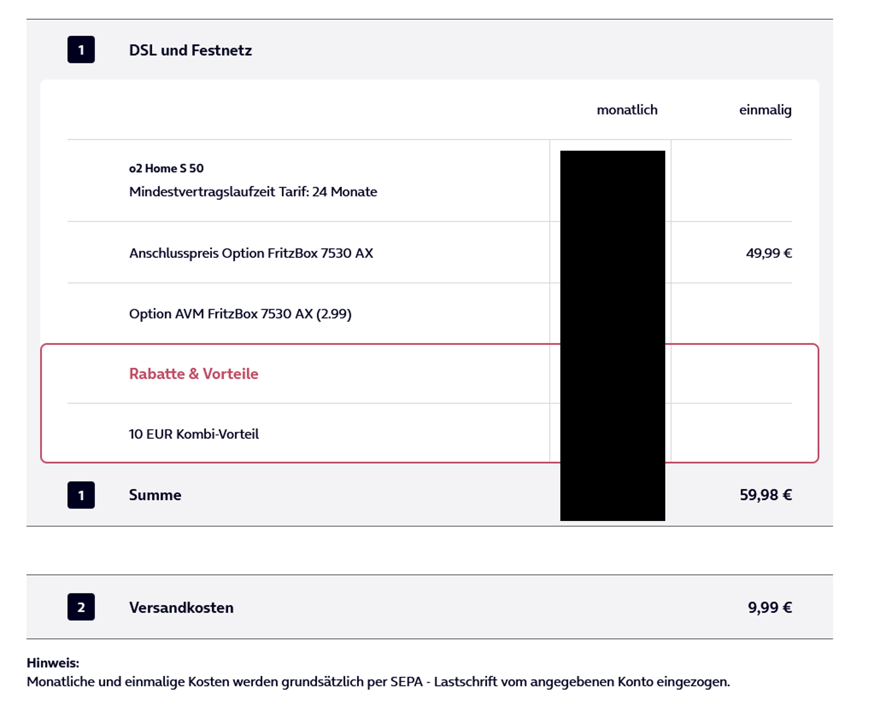 Angeboten wurde mir im Chat o2 Home S + Router. Das würde grundsätzlich auch passen. Allerdings verstehe ich den Bereitstellungspreis von 49,99 EUR nicht. Selbst als Neukunde erhält man diesen aktuell rabattiert für 9,99 EUR. Und das soll nicht für jahrzehntelange Kunden mit mehreren Anschlüssen gelten!?
