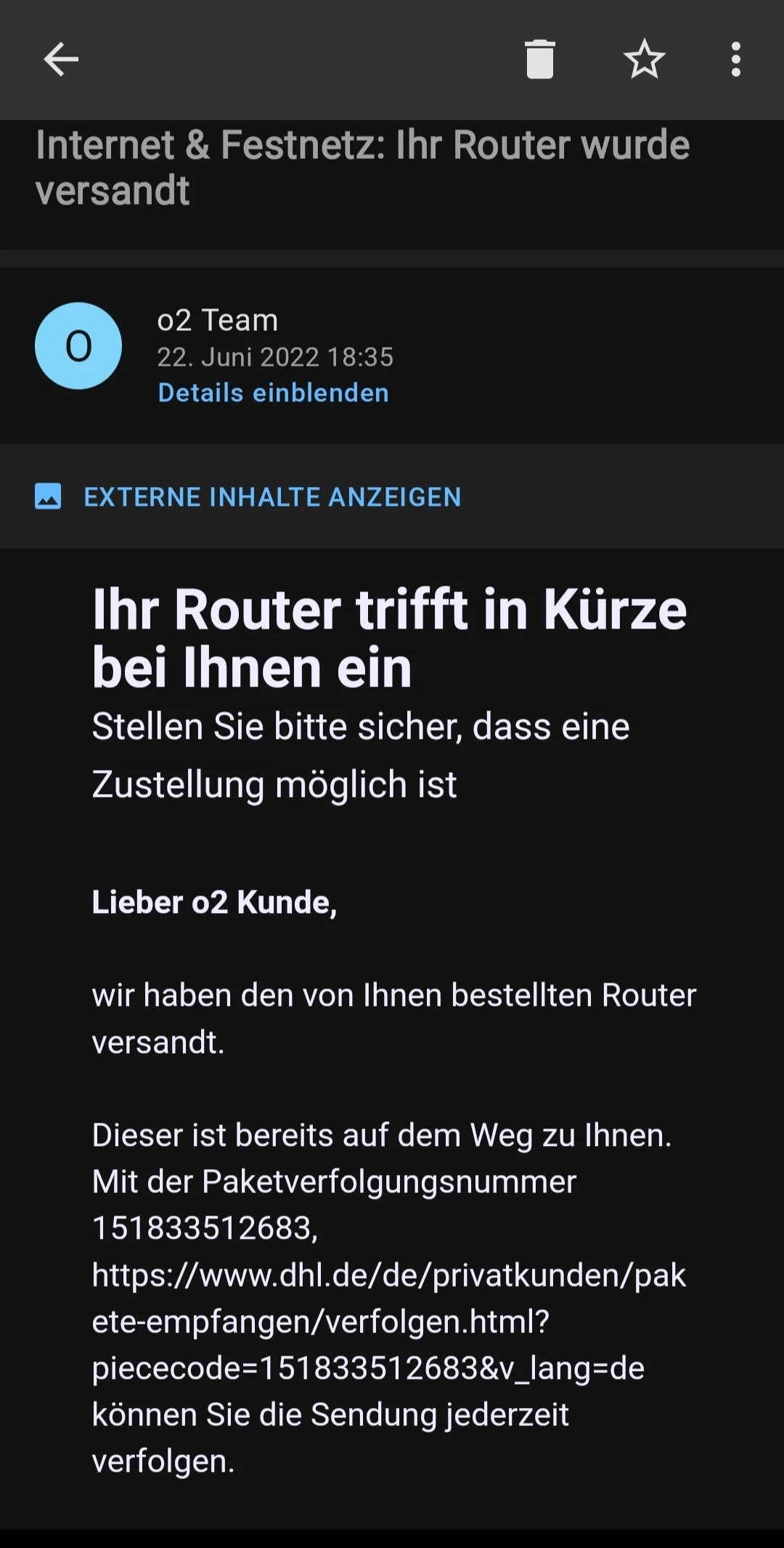 Ich rief gleich nachdem ich die SMS erhalten habe bei O2 an um mitzuteilen das ich den von O2 versendeten Router nicht mehr benötige. Die Mitarbeiterin sagte mir das sie den Auftrag dann storniert. Am selben Abend (gestern) erhielt ich ne Mail das der Router auf dem Weg zu mir ist.