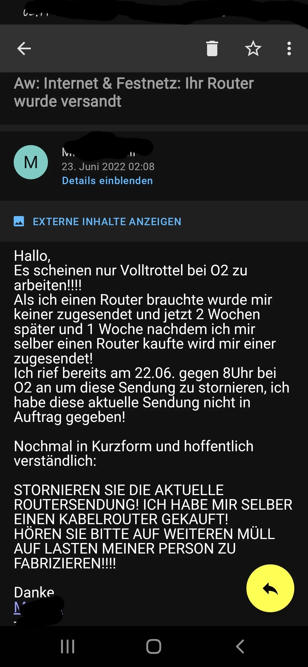 Jetzt knapp 2 Wochen nach Stilllegung meines alten Vertrages und Aktivierung des Kabelanschluss wird von O2 ein Router an mich versendet, den ich jetzt nicht mehr benötige da ich inzwischen ja selber einen kaufte!