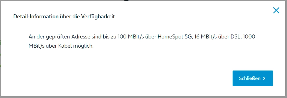 Ich habe für deine Anschrift einmal über unsere Internet Verfügbarkeit durchgeführt, nach einem Klick auf das kleine “i” ergab sich dann folgendes Bild: