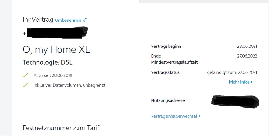 Frage: Mein Vertrag wurde zum 27.06.2021 gekündigt. Ich habe aber noch Internet. Und im Konto steht auch die automatische Verlängerung Vertragsbeginn: 28.06.2021 und Vertragsende: 27.06.2022.