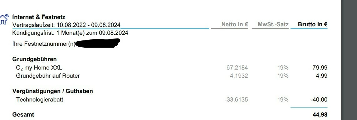 Der “Technologiepreis”  von deinem Screenshot ist kein Rabatt, der den Grundpreis mindert, sondern ein Aufpreis, der zusätzlich zu den ausgewiesenen 39,99 EUR für o2 my Home L (nicht XXL) berechnet wird. Also 39,99 EUR + 12,49 EUR +5,99 EUR Routermiete=58,47 EUR.