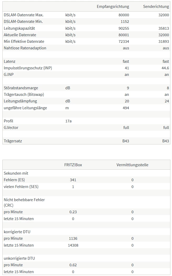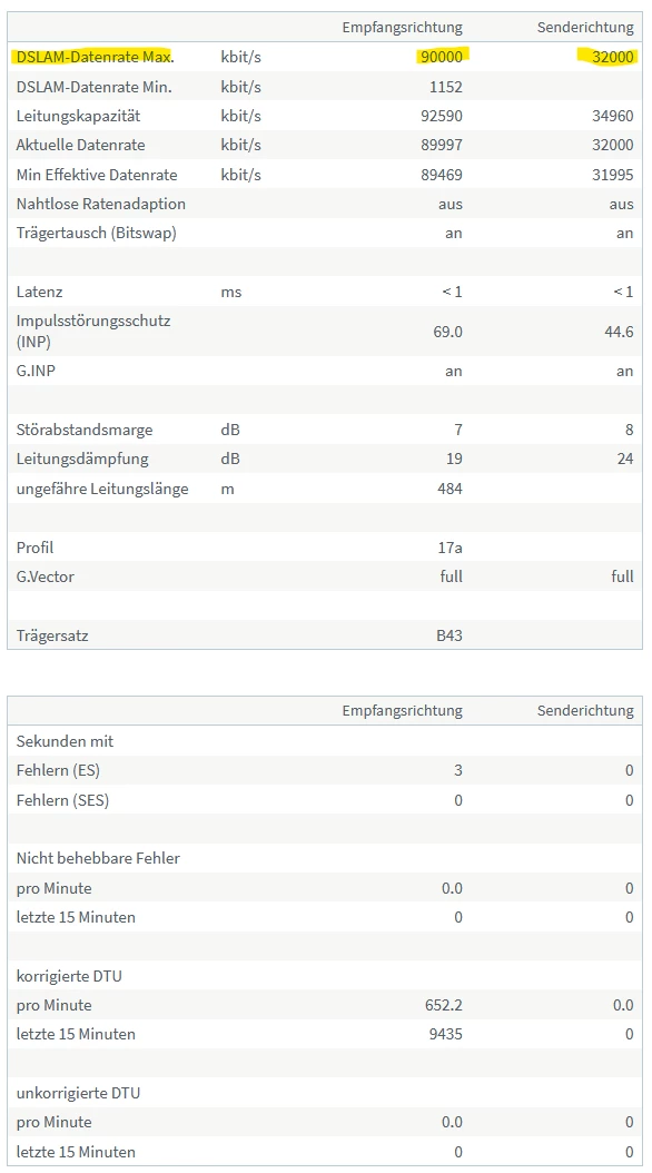 Poste zur Analyse auch bitte die Tabelle “DSL” unter “DSL-Informationen” mit allen Tabelleneinträgen und Fehlerzählern.
