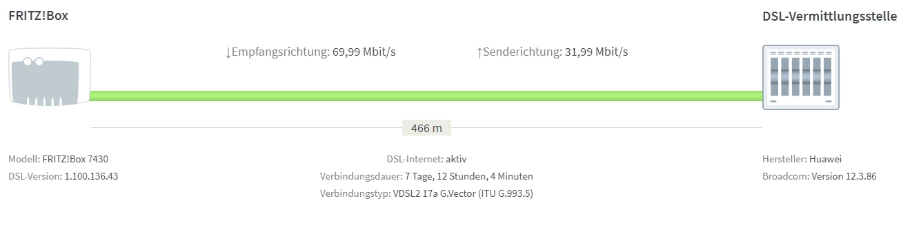 Bei der Leitungslänge geht VDSL mit einem aktuellen Endgerät (hier Fritzbox 7530 AX) im Download ca. 80 Mbit und Upload ca 30 Mbit.
