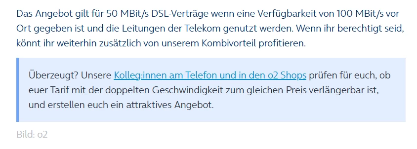 Hallo, ich habe bereits seit mehreren Jahren den Tarif o2 my Home M mit 50Mbit. Zusätzlich die o2 TV Option für 4,99 €/Monat. Aktuell bezahle ich 34,99 €/Monat.
