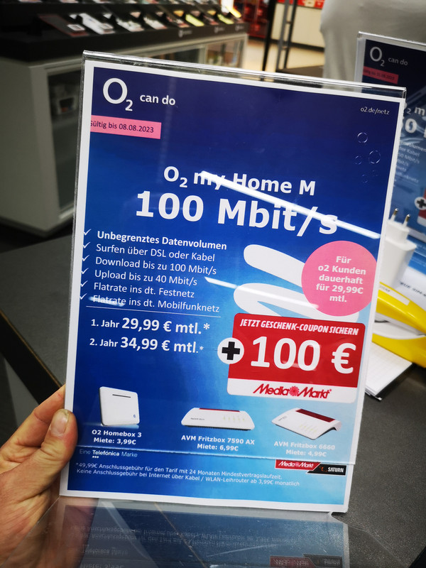 Bei Media Markt ist das Angebot siehe BILD https://i.postimg.cc/L6kbr3yH/IMG-20230815-115655.jpg von O2 ausgeschrieben. Dieses lautet für O2 Kunden dauerhaft 29,99€ durch Kombi-Vorteil. Habe dann alles mit dem netten Herrn abgeschlossen bis siehe weiteres Bild eine Vertragszusammenfassung kommt mit 34,99€. Hier sind einfach 5€ Technologiepreis aufgeführt.