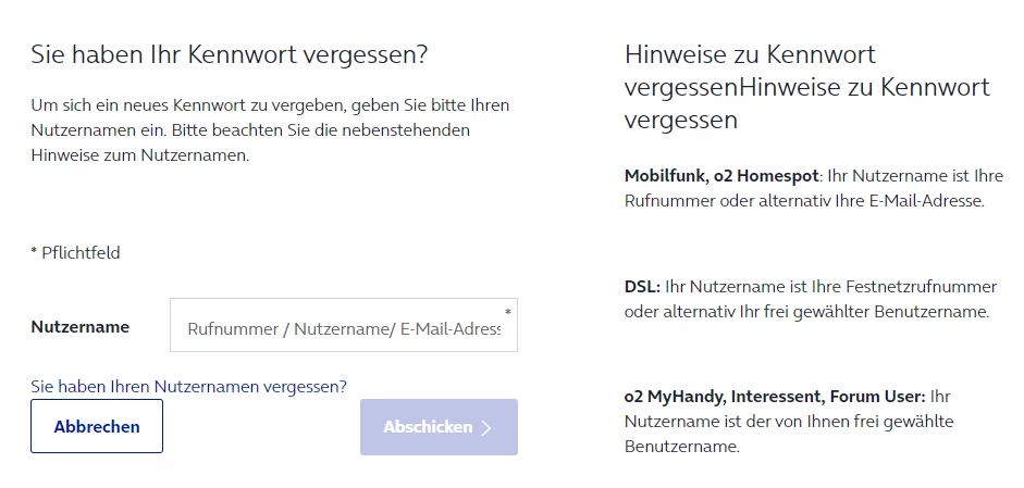 danke für deine Rückmeldung. Schade, dass es weiterhin noch nicht geklappt hat. Schau mal bitte, ob du beim Mein o2-Login (DSL-Vertrag ist in der Regel deine Festnetznummer mit Vorwahl) am Webbrowser auf Kennwort vergessen gehst: