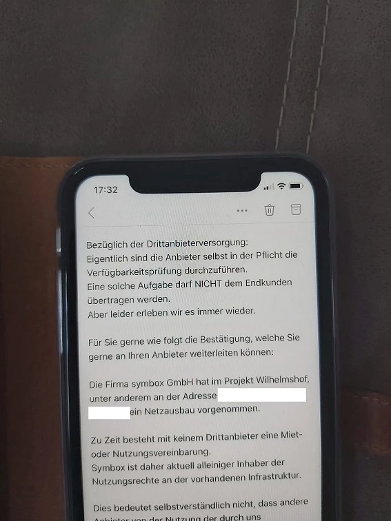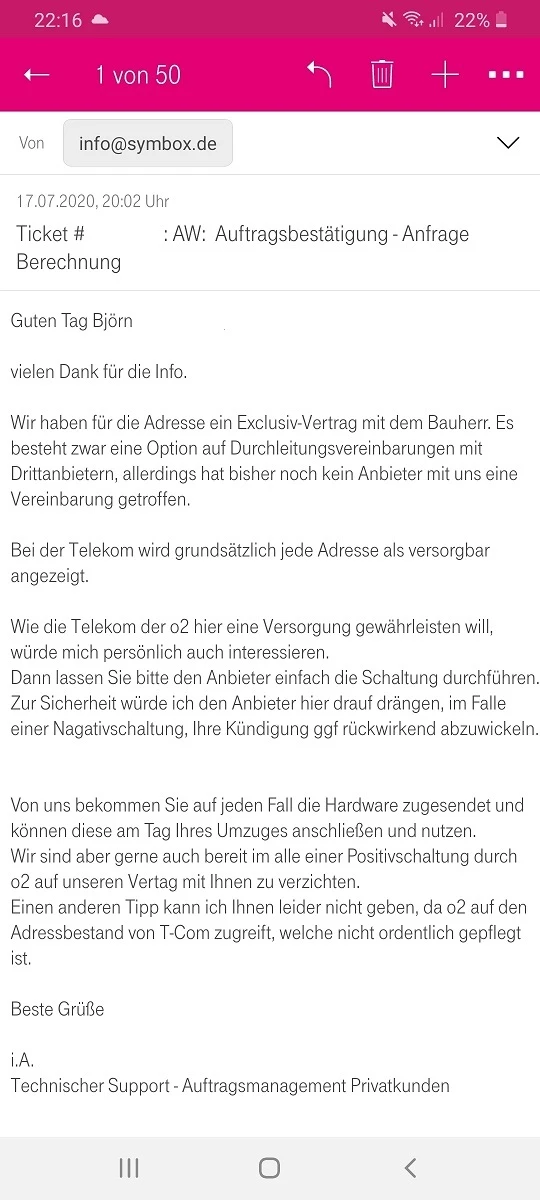 Ich ziehe zum 1.9. an eine neue Wohnadresse, an der ausschließlich Symbox Versorger von Internet und Telefon ist. Siehe Anhang. Dennoch behauptet o² sie könnten dort beliefern und gewährt die Kündigung nur zum Januar 22!