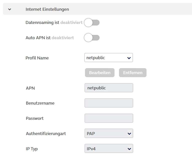 Ich habe dir gern einmal die IPv4 Adresse freigeschaltet. Bitte achte noch auf den APN *netpublic*