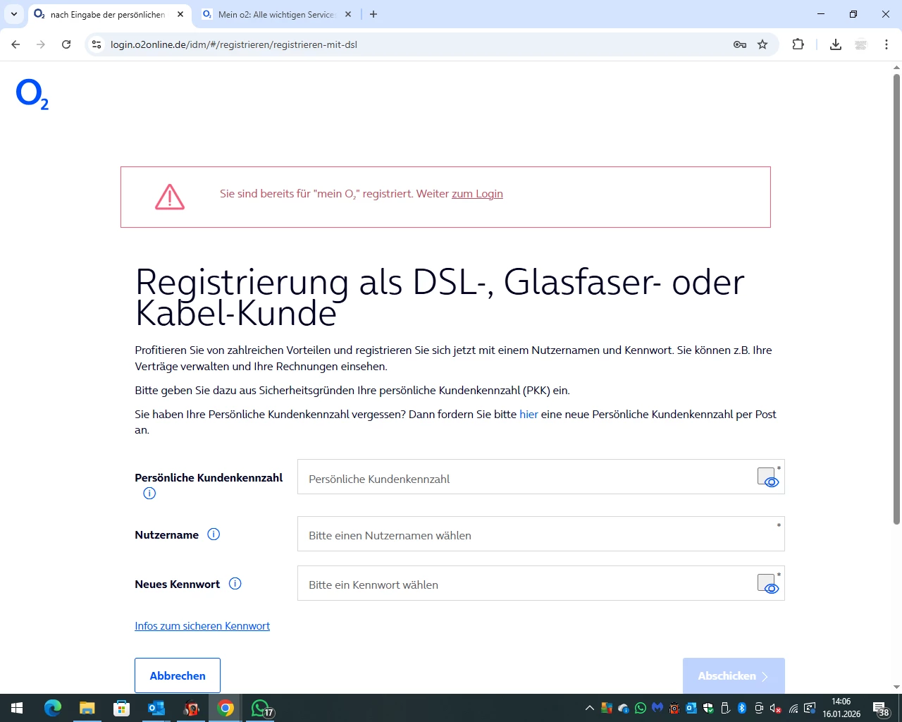 es geht nicht egal was ich mache es kommt immer sie sind bereits für mein o2 registriert…. ebenfalls geht meine leitung nicht am freitag sollte ein techniker kommen und am montag, es kam keiner….