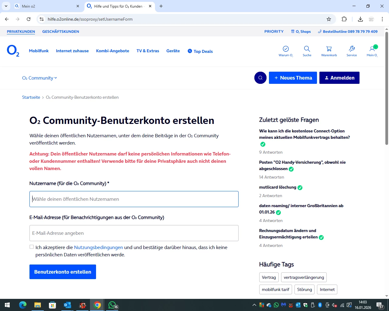 Versuche dann, mit einer anderen Mailadresse und einem anderen Benutzernamen ein neues Konto hier in unserer o2 Community zu erstellen.
