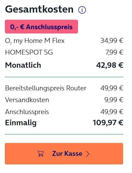 ich wollte den “My Home M Flex 5G 100 Mbit” Tarif bestellen. Im Bestellprozess scheint aber die Berechnung der Kosten auf der Homepage völlig falsch zu sein. Während des Bestellprozesses sieht man folgende Kosten: