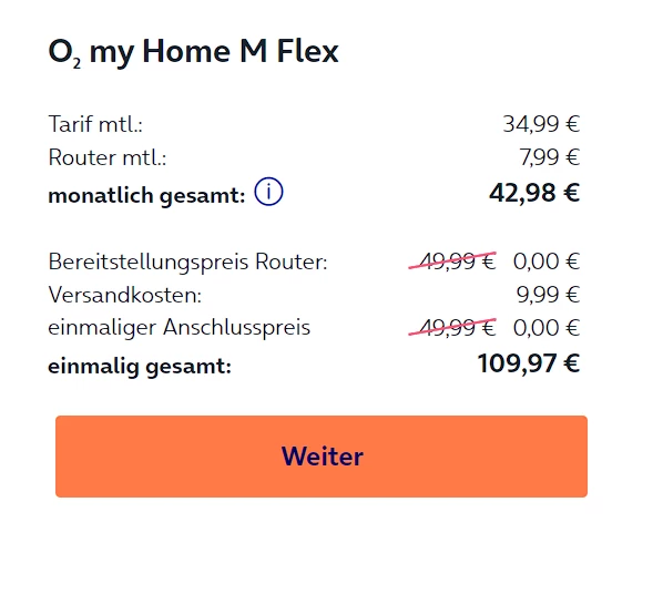 Es ist so, wie FaceHugger geschrieben hat. Bei den Flex Tarifen fallen aktuell sowohl der Anschlußpreis, als auch der Bereitstellungspreis für den Router an. Es würden also einmalig 109,97 EUR mit den Versandkosten anfallen.