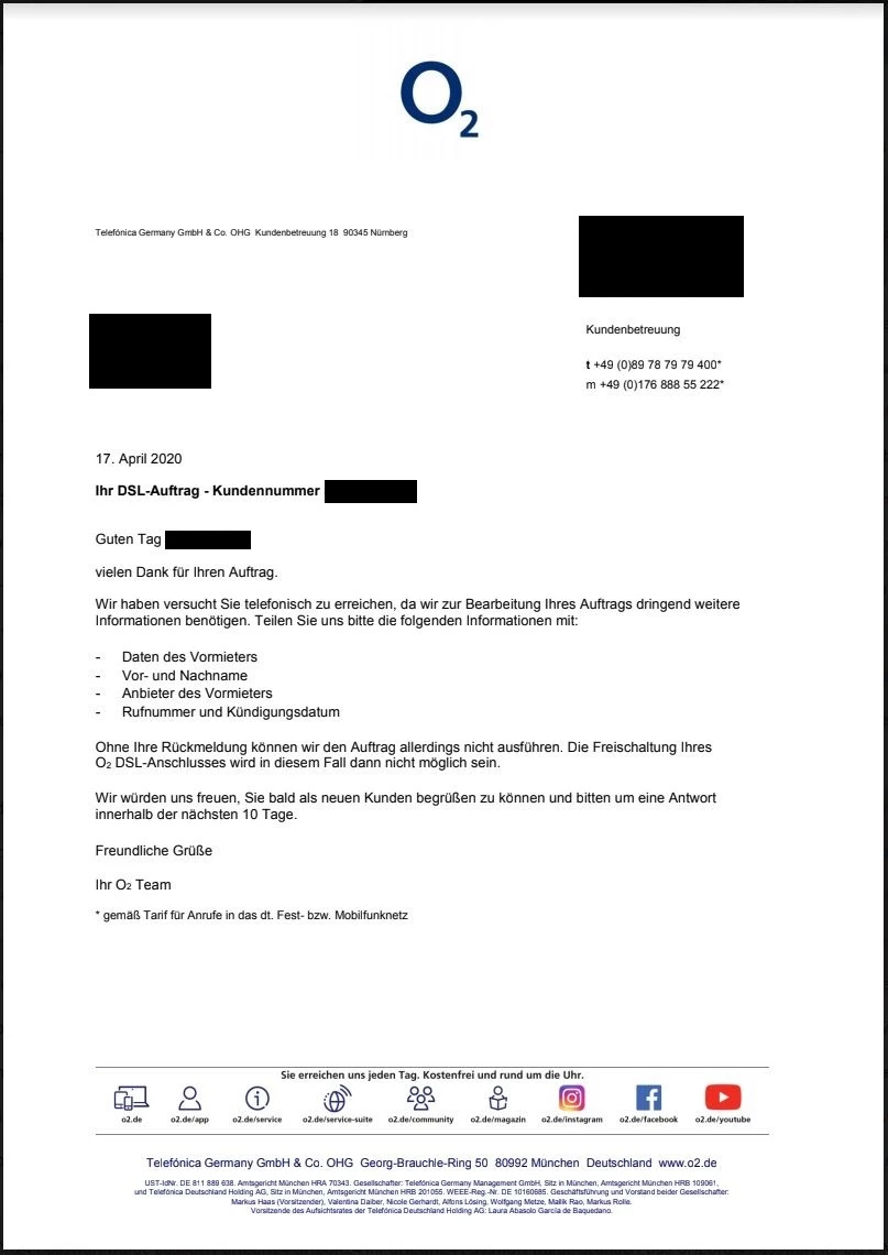 Heute habe ich einen Anruf vom O2 Shop verpasst. Anschließend kam eine Mail in der steht, dass ich doch bitte folgende Daten nachreichen soll: