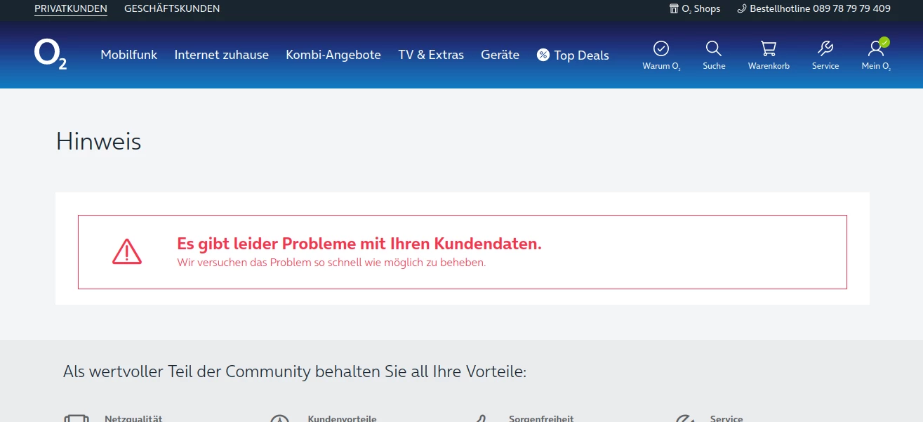 beim Zugriff auf die Option “Vertragsverlängerung” im o2-Kundenportal erhalte ich immer die Meldung, dass es ein Problem mit meinen Kundendaten gäbe.