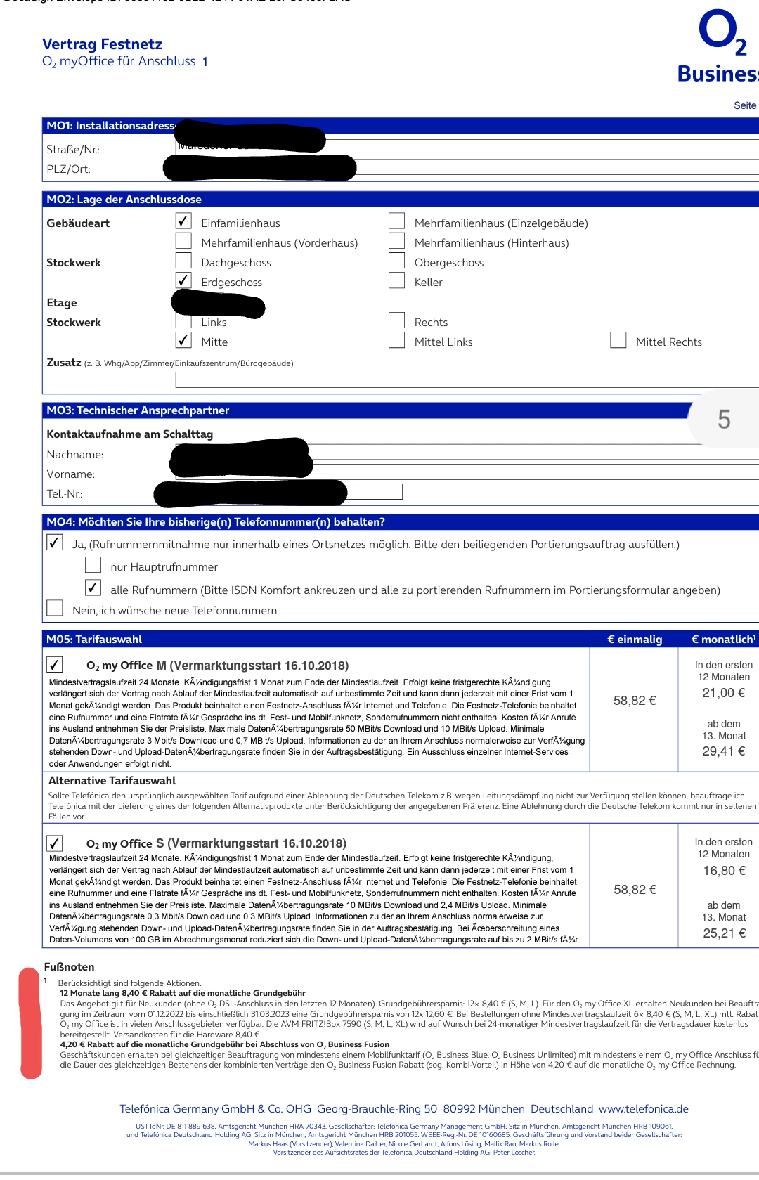 ich habe einen O2 my Office M Vertrag abgeschlossen und dort werden (bei Abschluss mit Mindestlaufzeit) in den ersten 12 Monaten 8,40€ Rabatt je Monat versprochen. So steht es auch in dem Vertrag, den ich unterschrieben habe. Auf der Rechnung werden aber nur 5€ abgezogen.