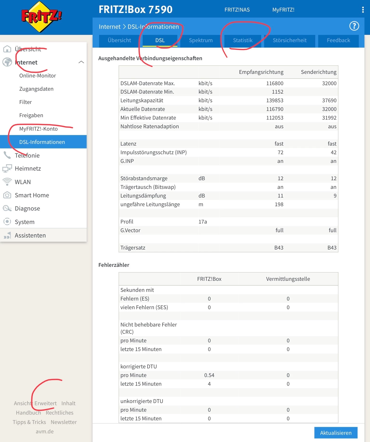 @mein öffentlicher Nickname in die Fritzbox einloggen über http://fritz.Box und dann von Reitern DSL und Statistik jeweils einen Screenshot machen. Wenn nicht schon geschehen unten links im Hauptmenü die Ansicht auf Erweitert umstellen.