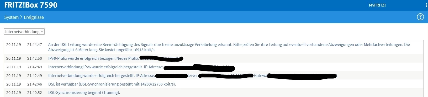 Um den Fehler eingrenzen zu können, wäre ein Screenshot der DSL-Tabelle der Fritzbox sinnvoll.
