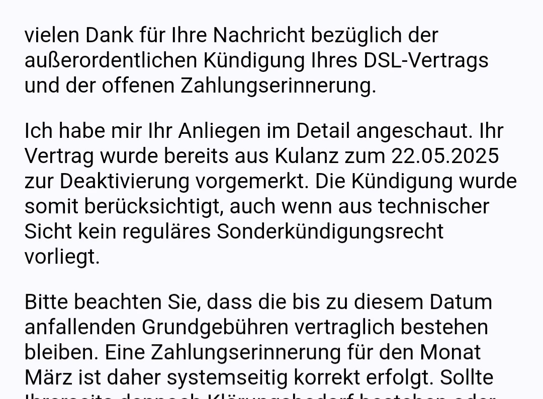 @o2_Lars , das Problem ist das der telefonische Kundenservice  von nichts weiß und der deutschen Sprache nicht wirklich  mächtig ist. Wieso bekomme ich Mahnungen für März , April und Mai. In der unten stehenden Mail vom O2 Kundenservice wird doch ganz klar beschrieben, dass alle Rechnungen ab 01.03.2025 gutgeschrieben werden.