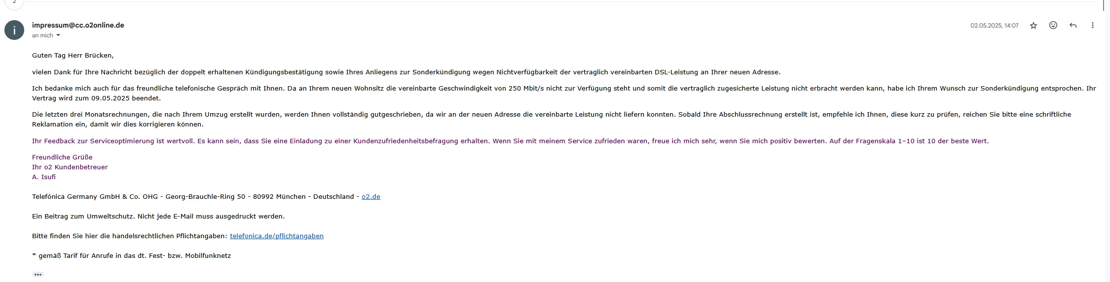 Und somit steht keine Sonderkündigung zu. Wer über das Formular den Anschluss kündigt. Da kannst mitschicken was du willst. Wird abgelehnt. ​@Paddy2025  Desweiteren kannst du schon mal überhaupt nicht entscheiden was verfügbar ist und was nicht. Dafür ist O2 und die Telekom zuständig