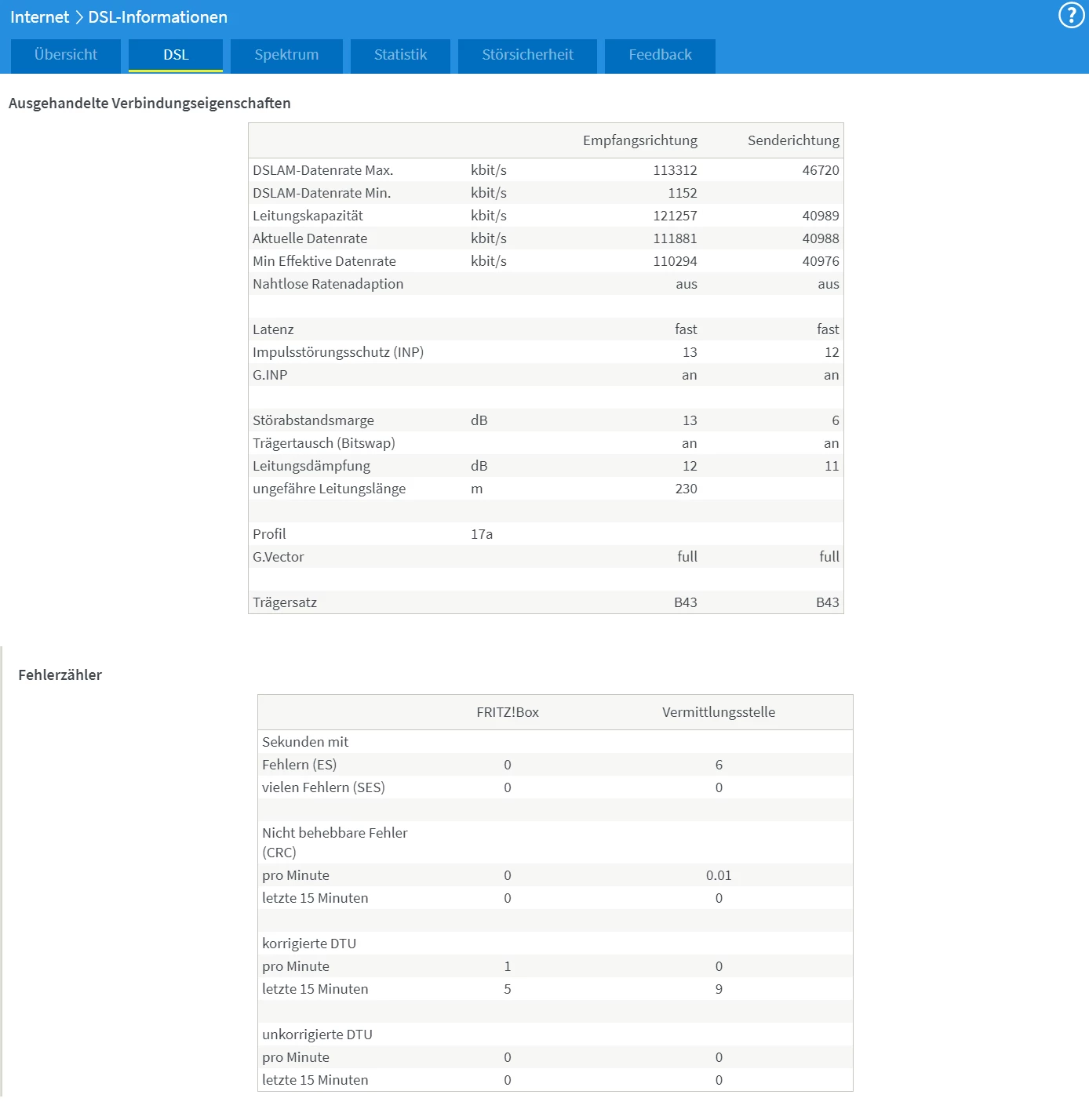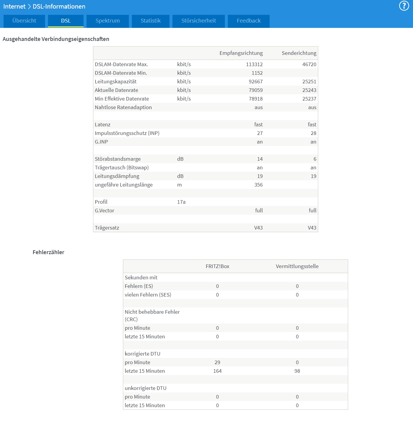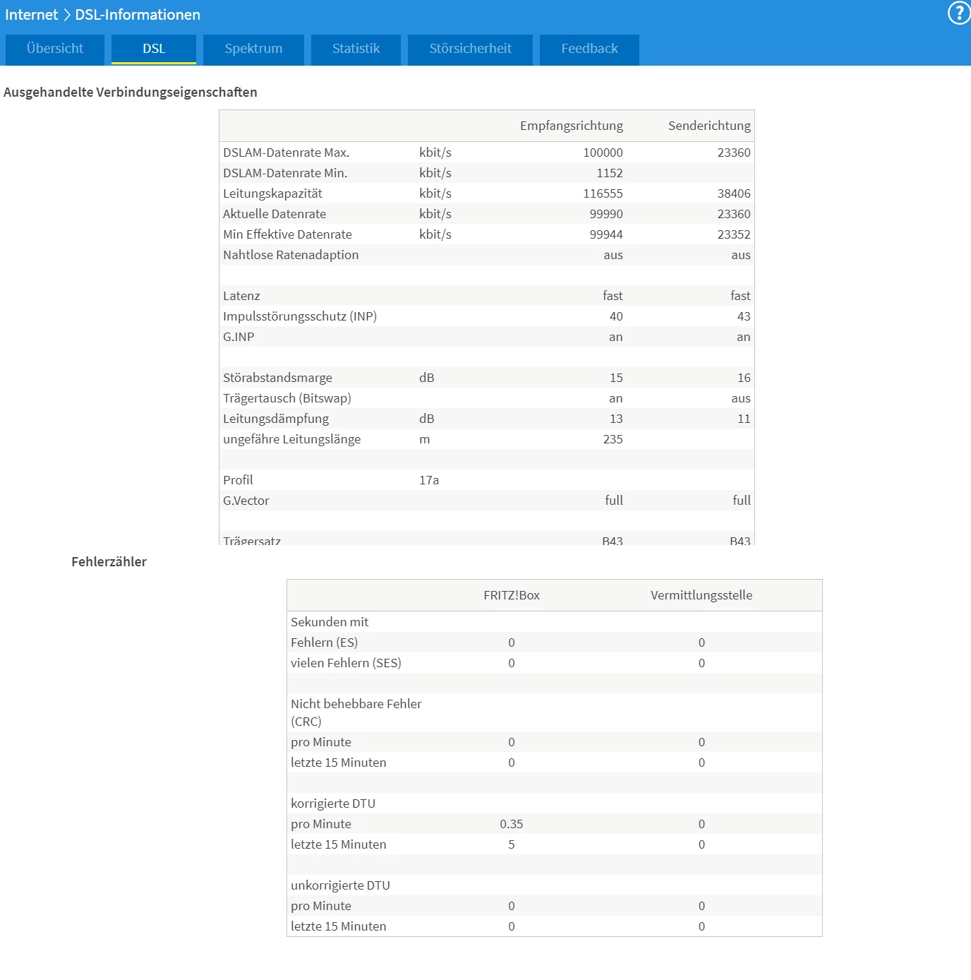 Setze bitte alle Störregler auf max. Performance und poste dann einen Screenshot der kompletten Tabelle unter dem Reiter “DSL” mit allen Leitungswerten und auch dem Fehlerzähler.