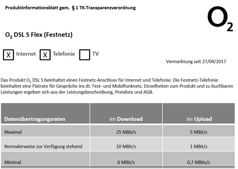 Warum bringst du dann das Produktinformationsblatt von o2 DSL S? Dieser o2 DSL S wird erst seit 27.04.2017 vertrieben. Das passt weder zu dem von dir eingangs genannten Tarif noch zu dem von dir angegebenen Jahr 2009. Entweder du hast das falsche Produktinformationsblatt heraus gesucht (was ich vermute), oder du hast bei deinen anderen Angaben gelogen.