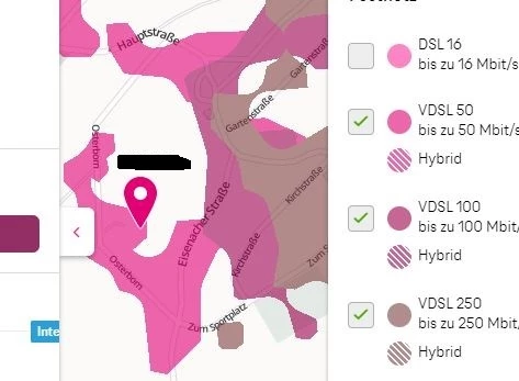 Laut Breitbandausbaukarte ist in unserer Straße jetzt komplett mind. 50MBit/s möglich, ich habe eine FritzBox 7490 (homebox2). Bei direkter Abfrage wird an meinem Anschluss auch 50MBit/s angegeben, 2 Häuser weiter 100MBit/s. Die Anschlussnr entspricht nicht meiner HausNr, da diese vor 2 Jahren in der kompletten Straße neu angelegt wurden.