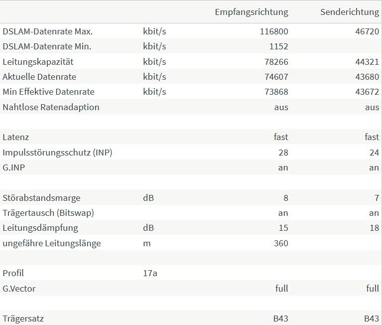 “DSL ist verfügbar (DSL-Synchronisierung besteht mit 74647/43037 kbit/s).”