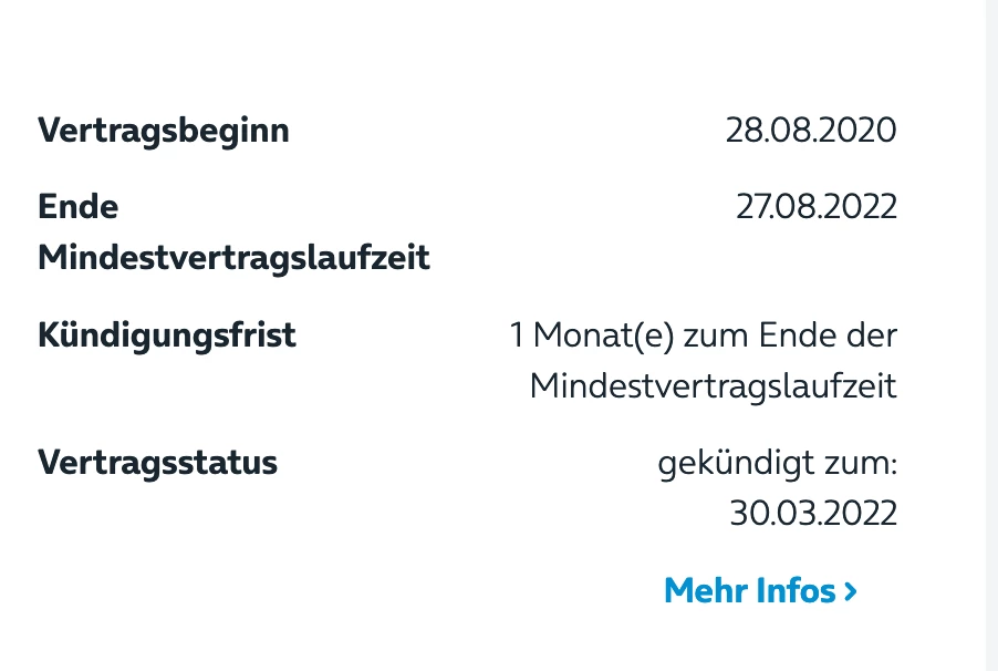Hier steht zwar “gekündigt zum 30.03.2022” (in meinem o2 Konto) aber nicht, dass die “Mindestvertragslaufzeit” auch zum 30.03.2022 beendet wird.