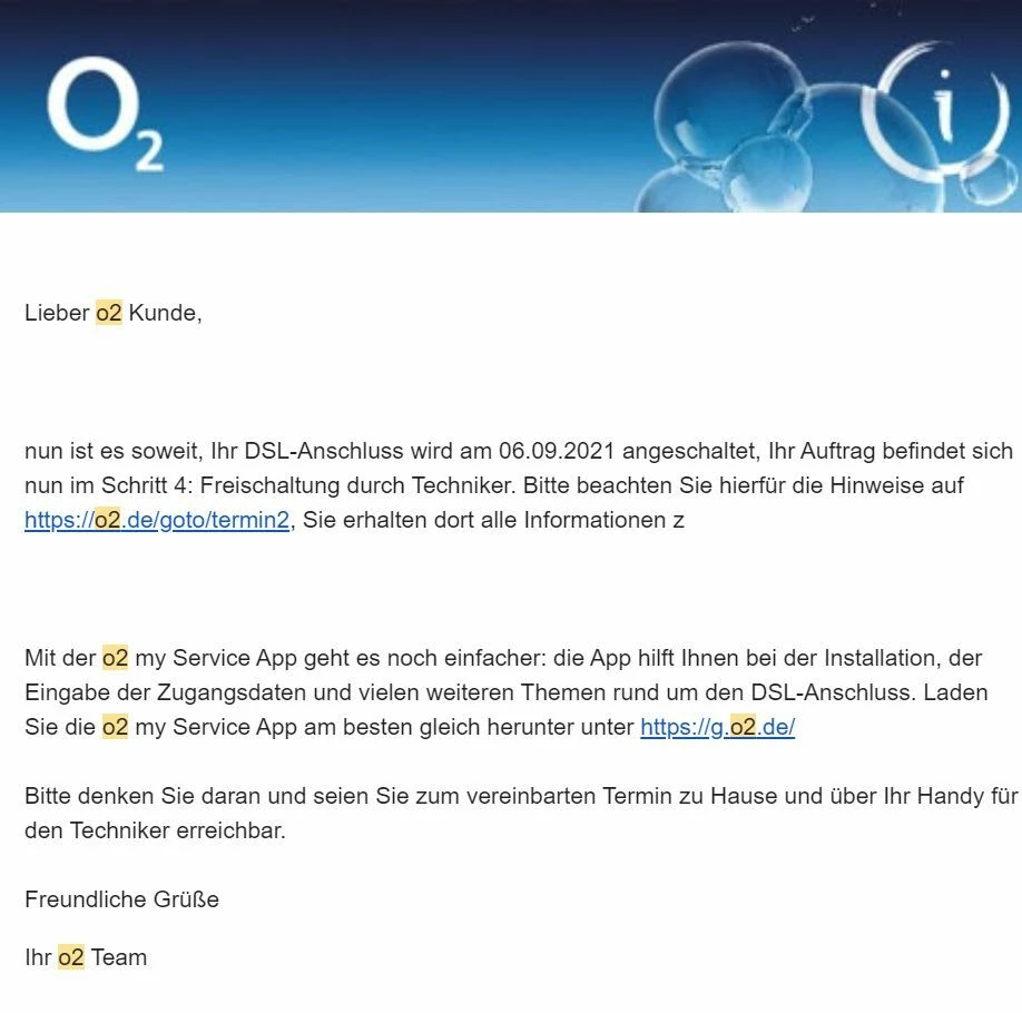 Ich habe am 29.07 Festnetz/DSL-Umzug beantragt (Auftrag : XXXXXXX ). Kurz danach habe ich die Bestätigung bekommen dass mein neuer Anschluss wie gewünscht am 06.09.2021 aktiviert wird.
