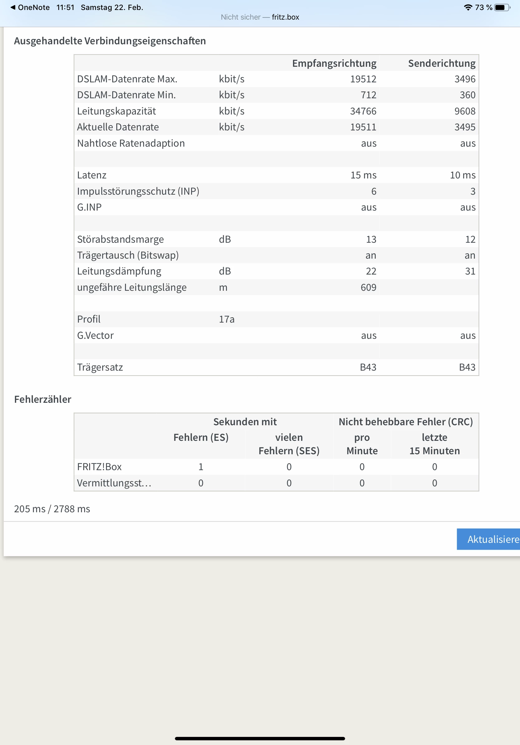 Ich habe seit geraumer Zeit gelegentliche Syncabbrüche und mein Port wurde von 25,4 auf 19,x gedrosselt. Nachdem am Wochenende wieder Störungen und Abbrüche waren, habe ich heute Um 14 Uhr eine Störung gemeldet und ein Ticket für einen Techniker am Mittwoch bekommen.