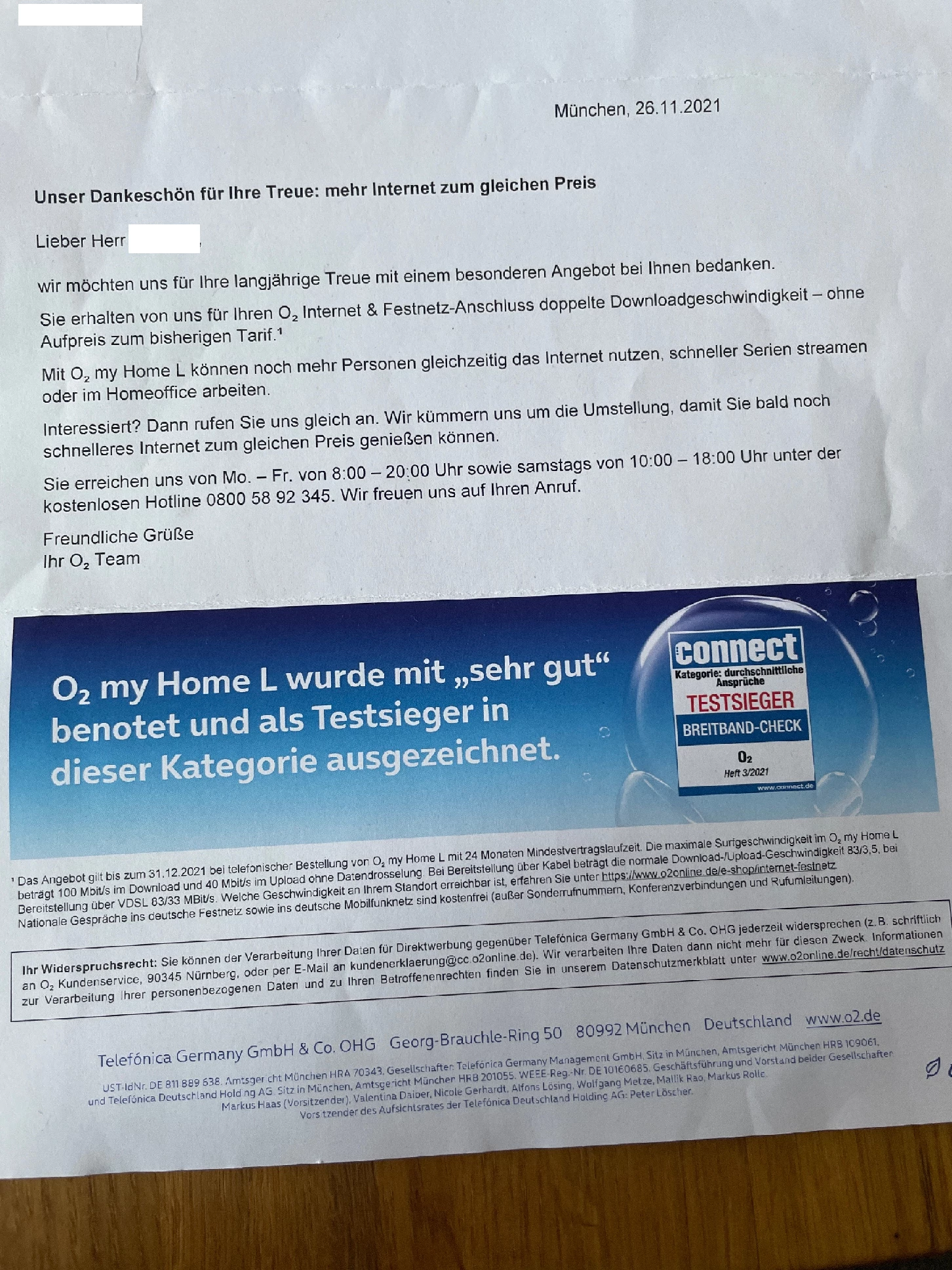 Guten Tag, ich habe per Post ein Angebot bekommen. Ich habe momentan o2 my home m und könnte kostenlos mit den gleichen Preis auf o2 my home L upgraden, wenn ich den Vertrag für 24 Monate verlängert, Leider geht bei der beigefügten Nummer keiner dran, auch nicht nach langer Zeit in der Warteschleife. Kann mir wer weiter helfen ?