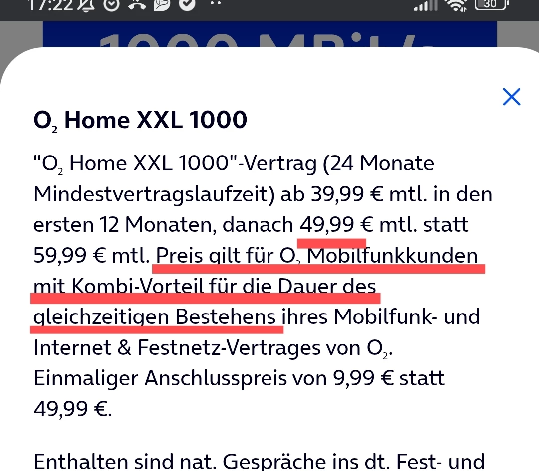 Ja, das hab ich gelesen. Du bekommst den Home xxl Kabel nur für 49,99€, wenn du einen o2  Mobilfunkvertrag als Erstvertrag unter derselben Kundennummer wie dem Home hast.