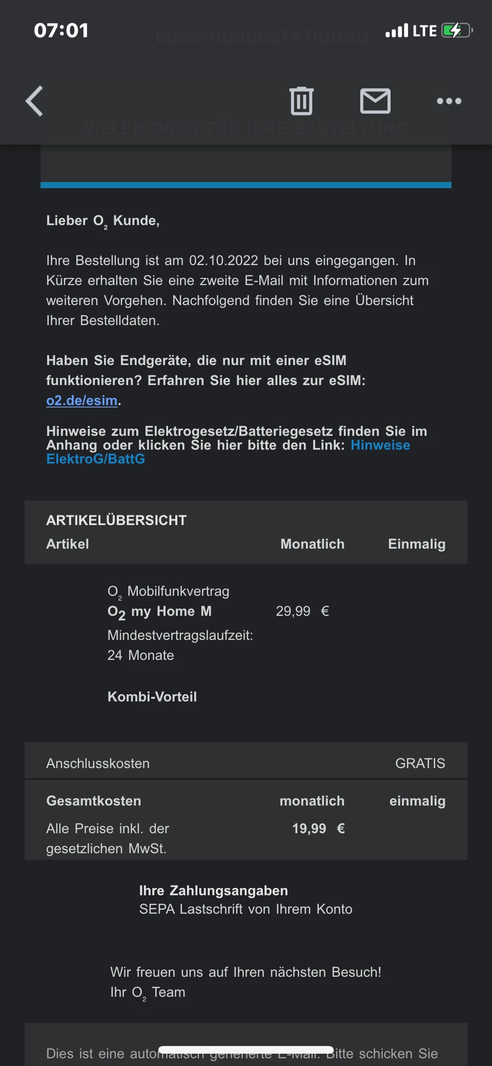 Ich habe vertrag abgeschlosen für o2 my home M für 19,90 habe email bestätigung und screenschot gemacht auch und sehe immer die rechnung 29,90. Habe auch jahrelang mobil vertrag vei o2?