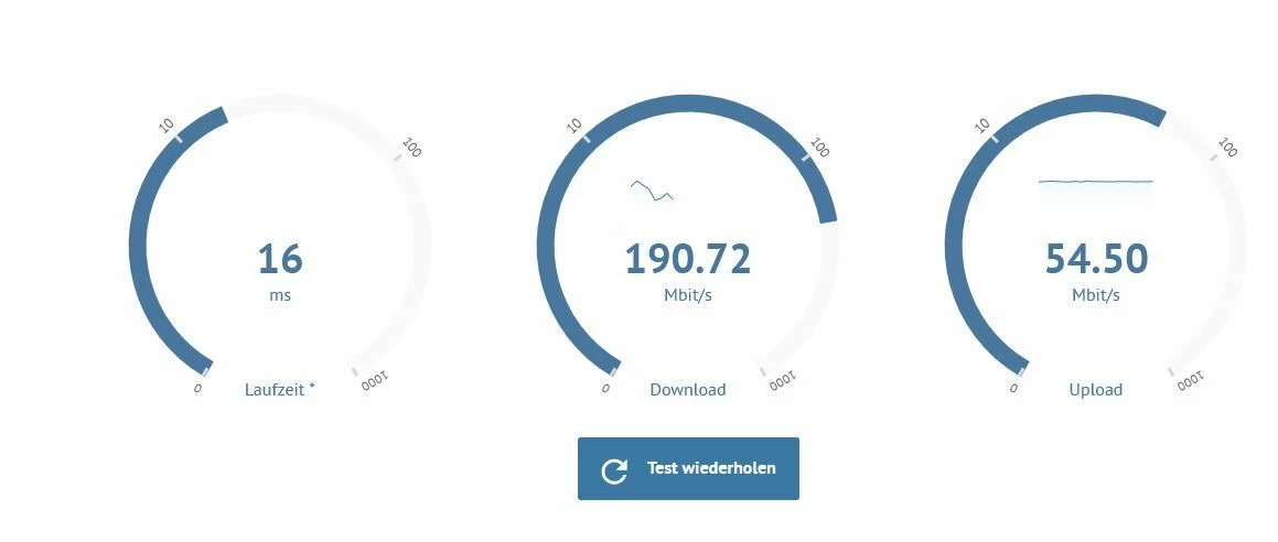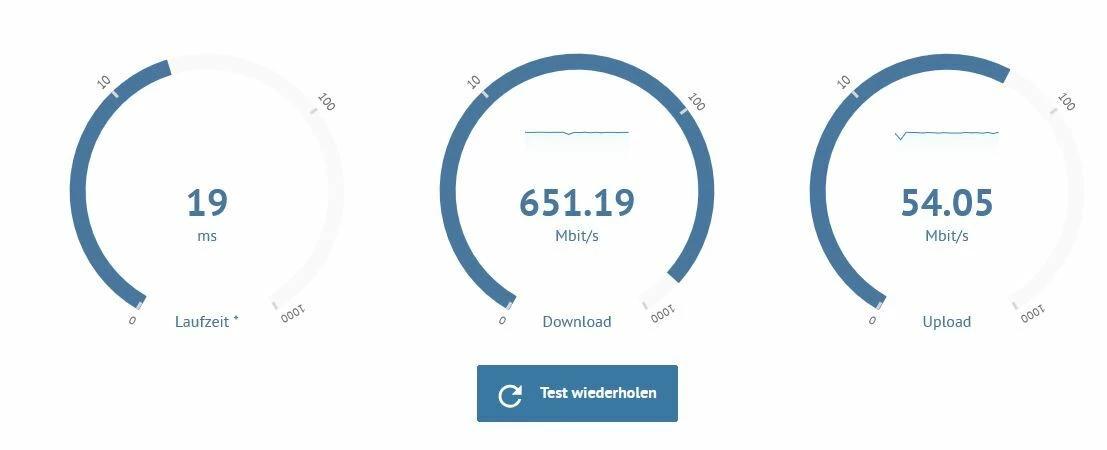 Das Internet hakt trotzdem immer mal wieder. Nach mehreren Speedtests der Bundesnetzagentur, erreichte ich maximal 330mBit. Heute Abend sogar nur 190mBit Download.