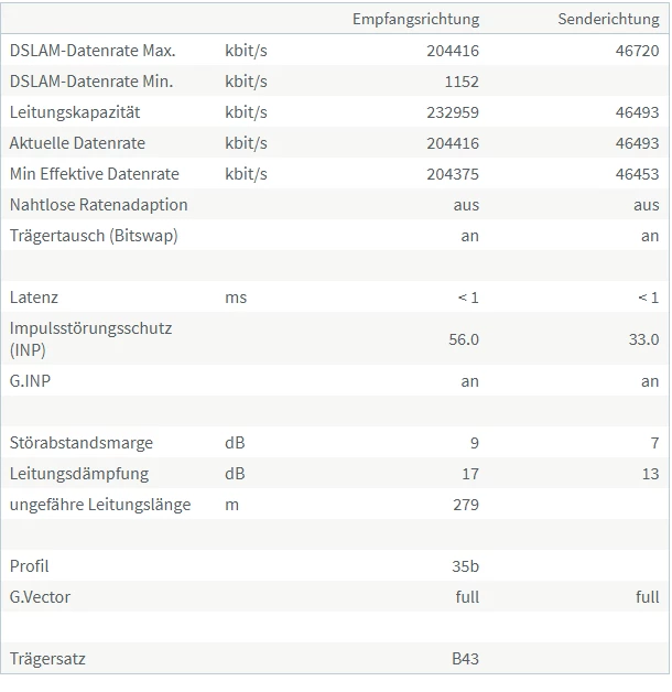 @The_Voice_70 Abermals herzlichen Dank. Das sind interessante Fakten, die ich - soweit ich sie überhaupt verstehe - noch nicht kannte. Ich werde in der nächsten Woche zu Hause direkt mal die Werte bei der FRITZ!Box auslesen und mit Deinen vergleichen. Gerade die Parameter Störabstandsmarge und Entfernung dürften doch unabhängig von der Bandbreite sein?! Auskunft bei der DTAG-Seite: „Bis zu 250 MBit“, dh hier keine Festlegung, was an Bandbreite möglich ist.