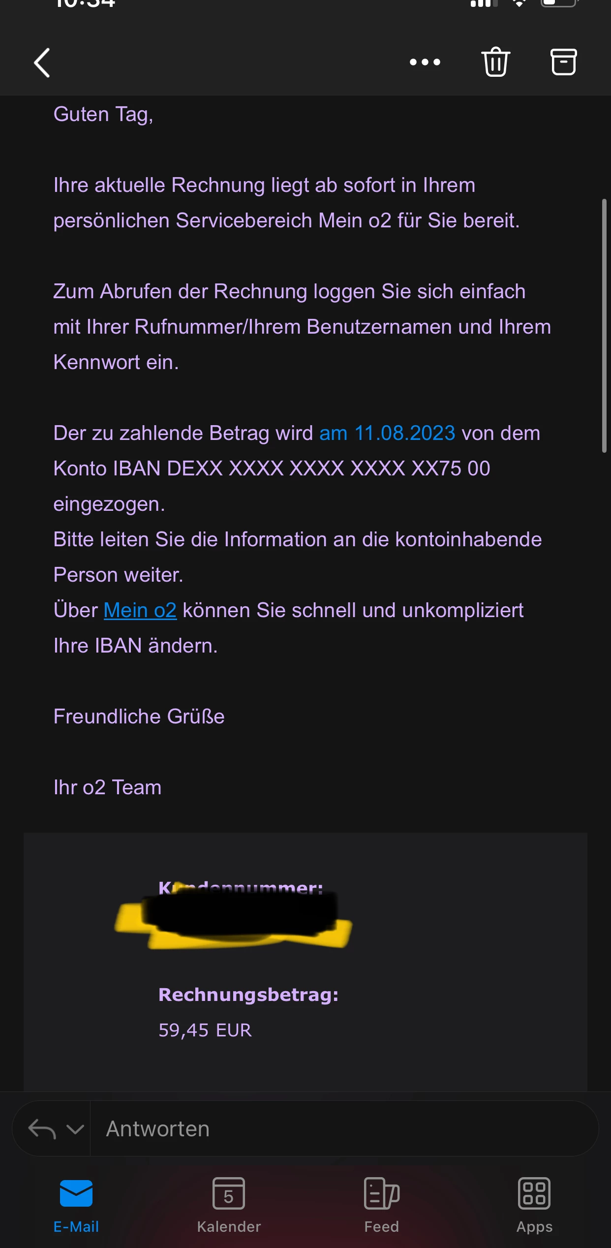 Der zu zahlende Betrag wird am 11.08.2023 von dem Konto IBAN DEXX XXXX XXXX XXXX 00 eingezogen.